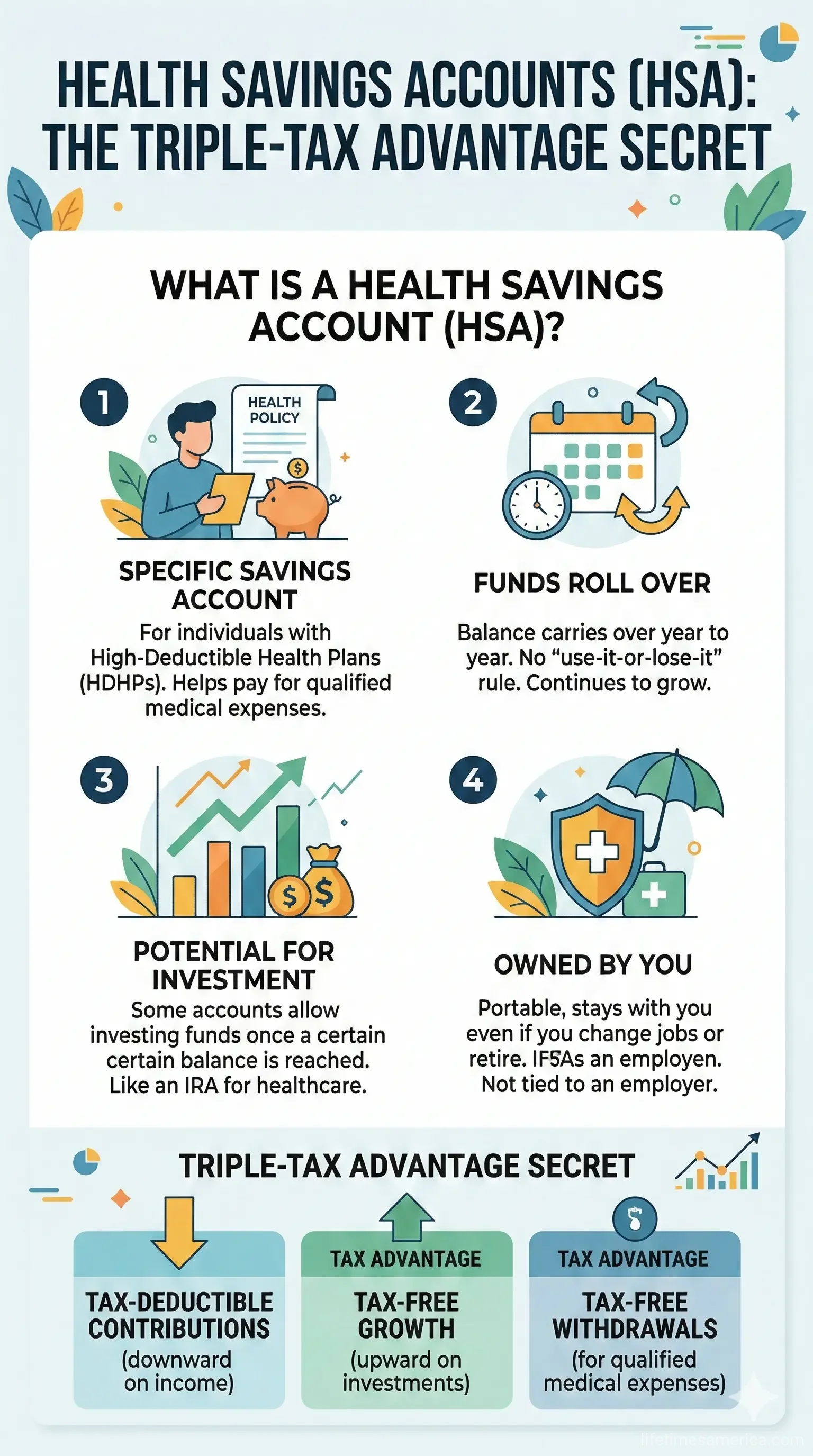 A Health Savings Account (HSA) is a tax-advantaged savings account designed for people with high-deductible health plans (HDHPs). It lets you set aside pre-tax dollars for qualified medical expenses, and the money rolls over year after year—it's yours to keep, even if you change jobs or retire.