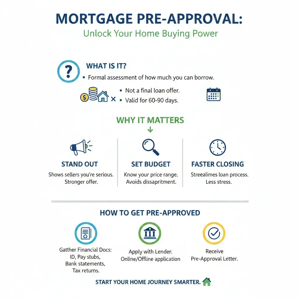 Mortgage pre-approval is a lender's conditional commitment to loan you a specific amount based on a thorough review of your finances. Unlike pre-qualification, which relies on self-reported info, pre-approval involves verifying your income, credit, and assets—making it a document sellers trust.[1][3]