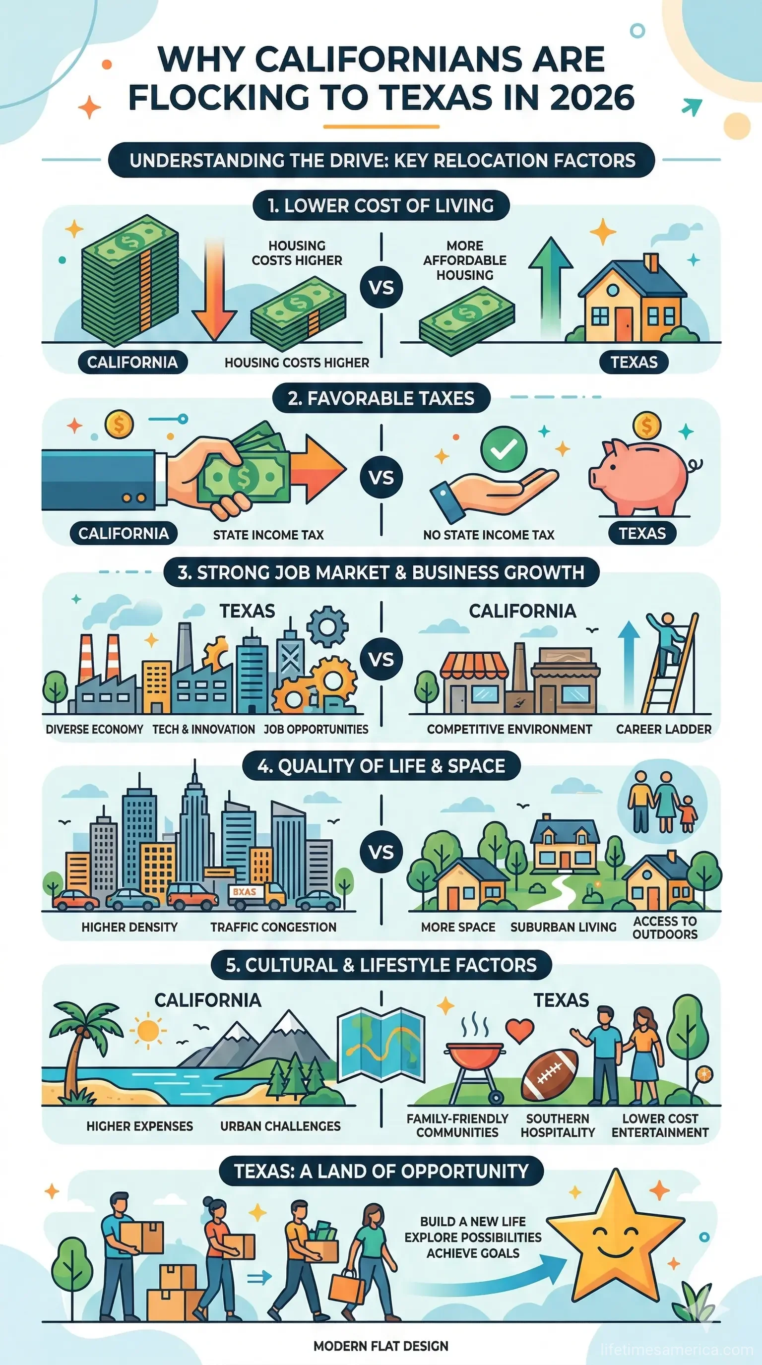 Imagine trading California's coastal fog and sky-high rents for Texas's wide-open spaces, barbecue smoke, and no state income tax. Every year, tens of thousands of Californians make this bold move, drawn by lower costs and bigger opportunities. If you're eyeing a 2026 relocation, this ultimate guide covers everything from budgeting your move to settling into your new Lone Star life.